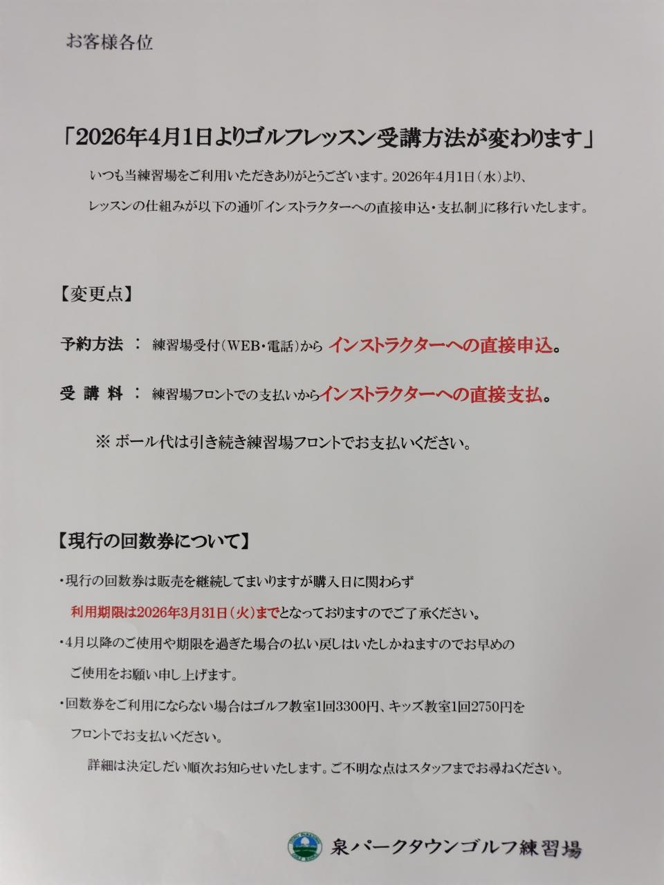 ゴルフレッスンについて下記の通り変更になりますのでお知らせいたします。